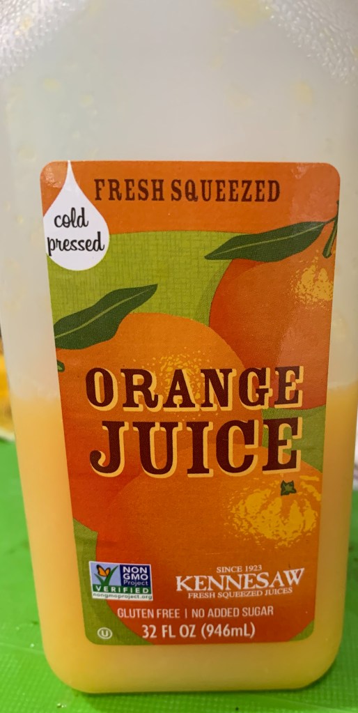 Then, I add some fresh squeezed orange juice to the blender. I add enough orange juice so that the mixture blends into a smooth liquid. I like my smoothie room temperature and runny so that I can drink it easy. I found that when I couldn’t eat that the more “liquidy” my smoothie was; the easier it was to get down.