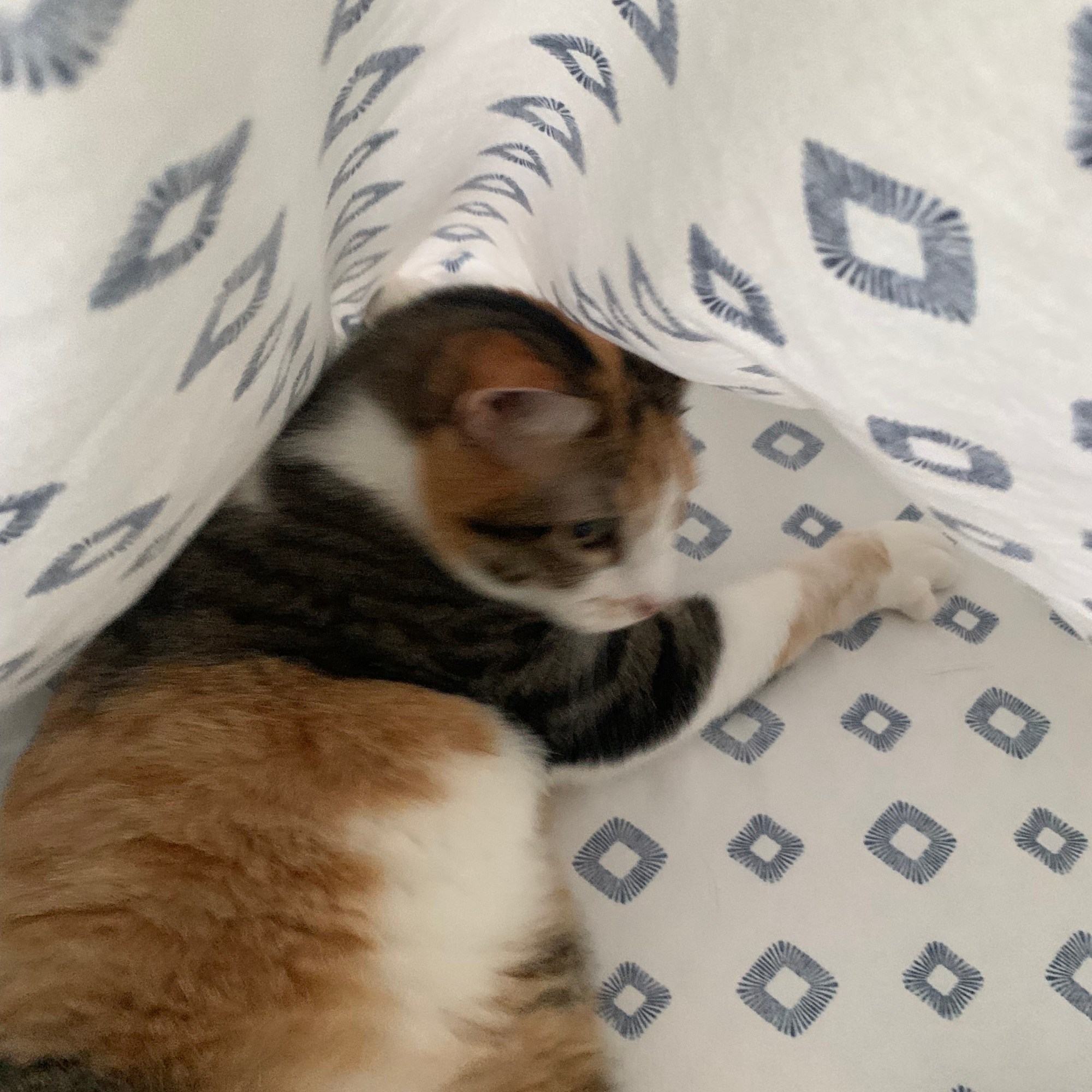 When I returned home, Tallulah, our cat, had received a package. Quick history – she was a feral and very sick kitten that we rescued at 3 months old. She loves the outside and tries to find her path back to freedom at all times. One of her favorite places is the screened-in porch as she watches the birds and all lizards that seem to walk closely to the screen. Always waiting by the door for us to return, she tends to be more of a dog than a cat. She loves nerf guns and comes running to the sound of us taking them out. She can jump the height of our sliding glass door to pull one off which is amazing to see. Personality abounds with Tallulah whether a constant companion during puzzles or a snuggle with us in a fuzzy blanket, she brings a smile to everyone’s face and sometimes a bite.